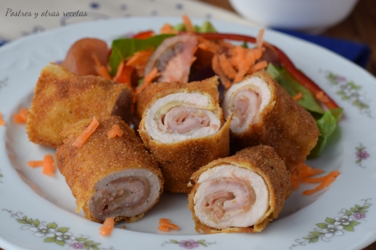Los flamenquines clásicos son de cerdo con jamón serrano, pero podéis hacerlos con pollo o ternera y rellenarlos con lo que queráis: queso, jamón cocido, pimientos, etc., etc. Delicioso el toque crujiente que les da el empanado.