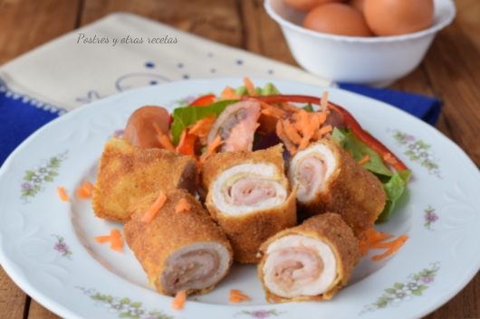 Cascamos los huevos en un plato hondo y los batimos con una pizca de sal. Rebozamos los rollitos en harina, luego en huevo y luego en pan rallado.