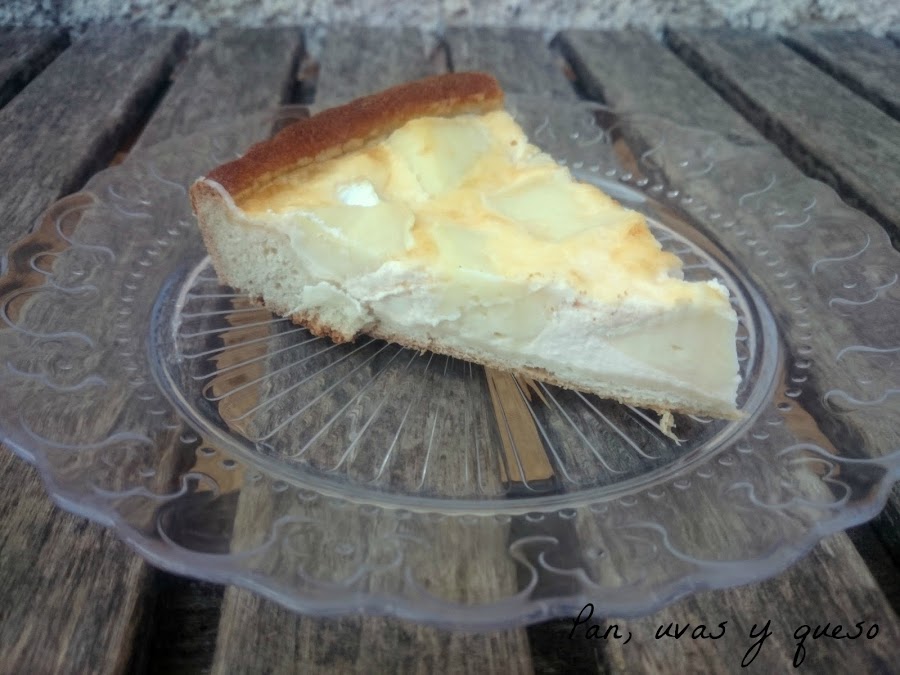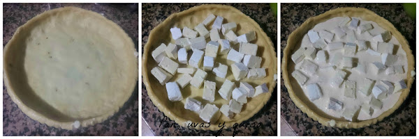 Sacamos la masa de la nevera y ponemos el queso sobre ella. Añadimos la mezcla de huevos y crême y horneamos durante 30 minutos, aproximadamente.