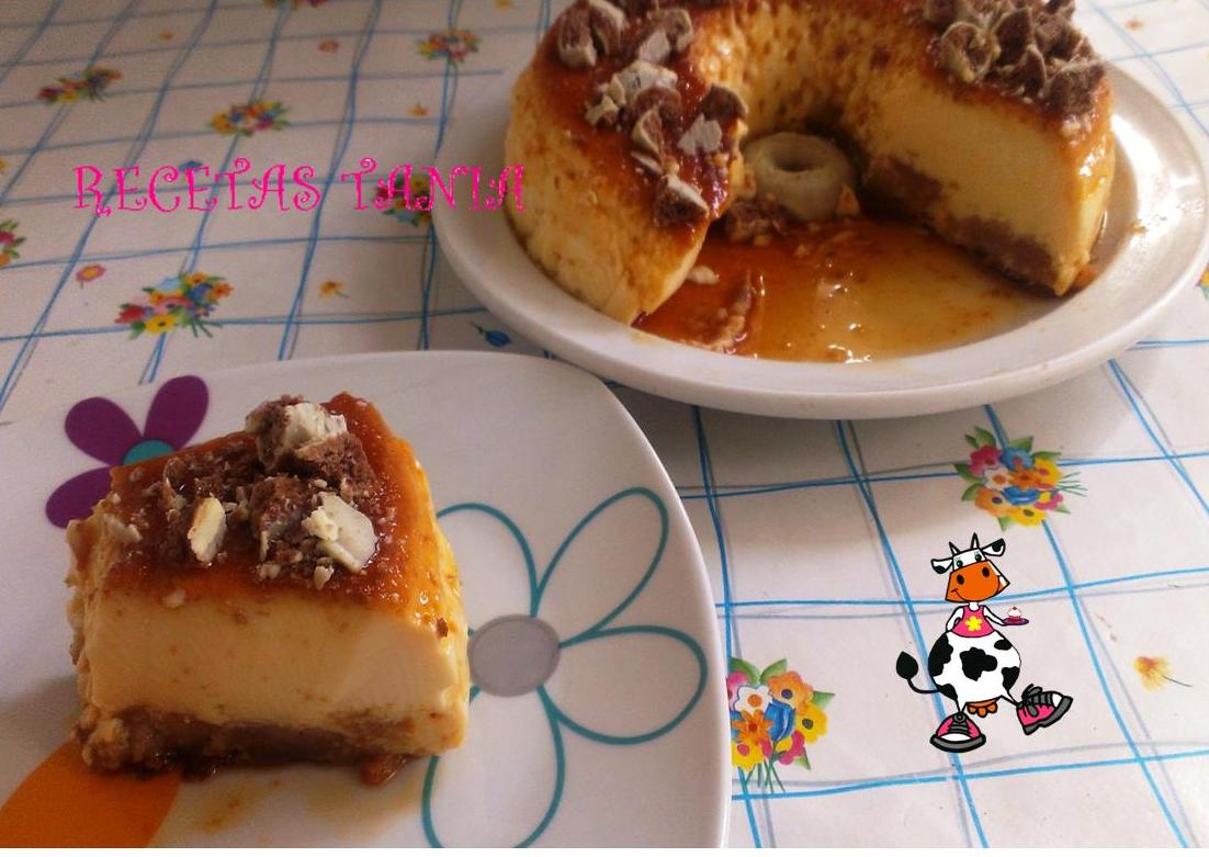 En un bol ponemos los huevos y batimos con una batidora eléctrica de varillas. Añadimos los 4 vasos de leche,las 4 cucharadas de leche condensada,la cucharada de esencia de vainilla y seguimos batiendo. Troceamos las galletas, las añadimos al bol y removemos. En el molde que vayamos a usar para hacer el flan ponemos el caramelo liquido y añadimos al molde lo que tenemos en el bol. Previamente en el horno tendremos la bandeja con agua (para hacer el flan al baño maría) y el horno puesto a 200º. Metemos el molde y dejamos que se haga,tarda una hora en hacerse,pero para estar seguro metemos un palillo y si sale limpio es que está terminado. Dejamos que se enfríe y metemos en la nevera. Una vez bien frío desmoldamos,yo para decorar troceé unas galletas de chocolate blanco (filipinos) y se lo puse por encima al flan. Está riquísimo!!! ;)
