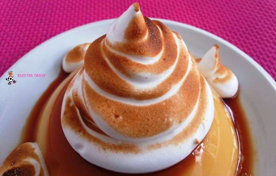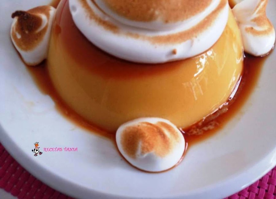 En un bol ponemos los huevos, batimos con la batidora de barillas,añadimos el azúcar y seguimos batiendo. Añadimos la leche y batimos. Ponemos toda la mezcla en el bol donde tenemos el caramelo y metemos al baño maria en el horno unos 50-60min a 200º (siempre dependerá del horno) para saber si está terminado yo pincho el flan y si sale limpio es que ya está terminado. Cuando esté bien frío desmoldamos y decoramos con merengue,con la ayuda de un soplete quemamos un poco el merengue para que tenga el saborcito de azúcar quemada.