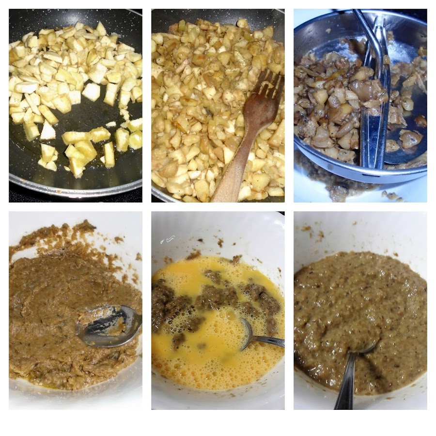En un pasapurés, triturar las berenjenas, incorporar la leche y los huevos y mezclar bien.