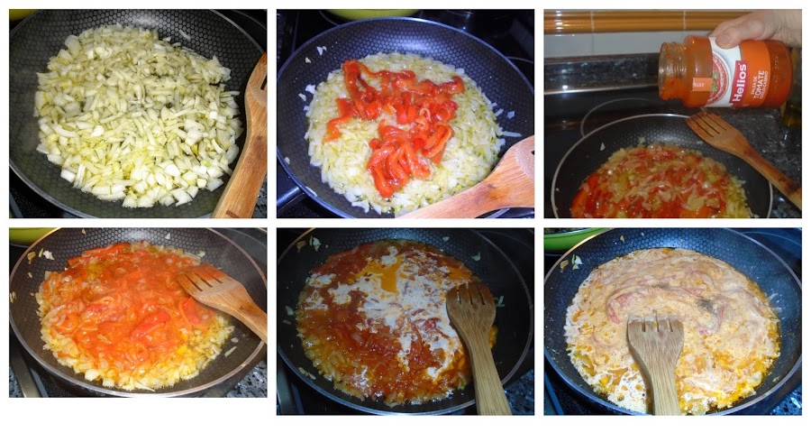 Cuando se haya dorado un poco el pimiento añadimos medio bote de tomate casero Helios, removemos para que se sofría el tomate unos minutos y añadimos la nata (crema de leche) liquida y dejar unos minutos a fuego lento.