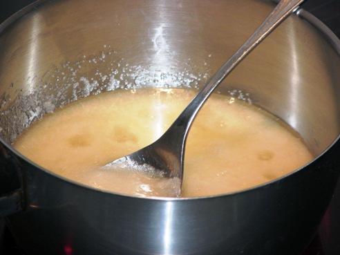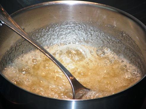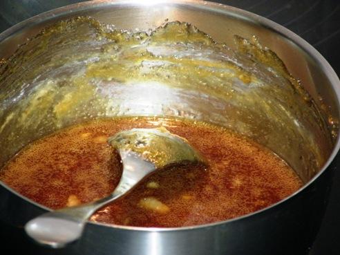 A continuación hacemos el caramelo, en un cazo ponemos el azúcar con el whisky a fuego fuerte, vamos removiendo hasta que tal y como veis en las fotos se hace el caramelo.