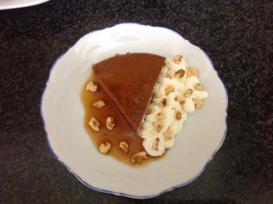 A continuación en un bol añadiremos los huevos, las dos cucharadas de café soluble (si queremos podemos utilizar café descafeinado) y las cucharadas de azúcar; lo batiremos todo bien e iremos aportando la leche (deberá estar tibia) removiendo para que la mezcla sea homogénea. Añadimos a la softiera y antes de meter esta en la olla pondremos un vaso y medio de agua en ella. Ya solo tendremos que colocar la tapa rápida poner a fuego fuerte y cerrar programando a continuación el audiotherm 8 minutos en la función turbo. Cuando la zona roja del visiotherm llegue a la función turbo y nos avise el audiotherm bajamos el fuego al mínimo y esperamos los 8 minutos, apagamos el fuego y dejamos despresurizar la olla, seguidamente la abrimos y sacamos nuestro flan poniendo un plato y dando la vuelta para posteriormente dejar enfriar. Cortaremos la ración y adornaremos en este caso con nata (crema de leche) y nueces.