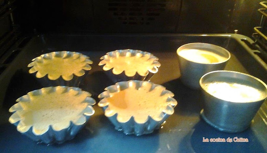 Echamos la preparación en los moldes que hemos preparado y los ponemos en una fuente de horno con agua caliente hasta media altura.