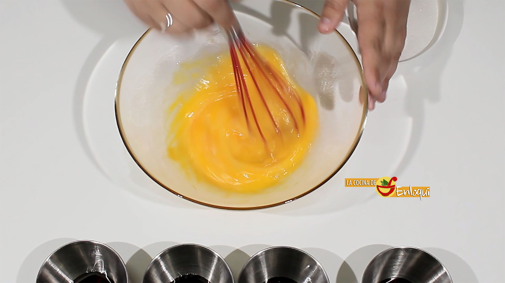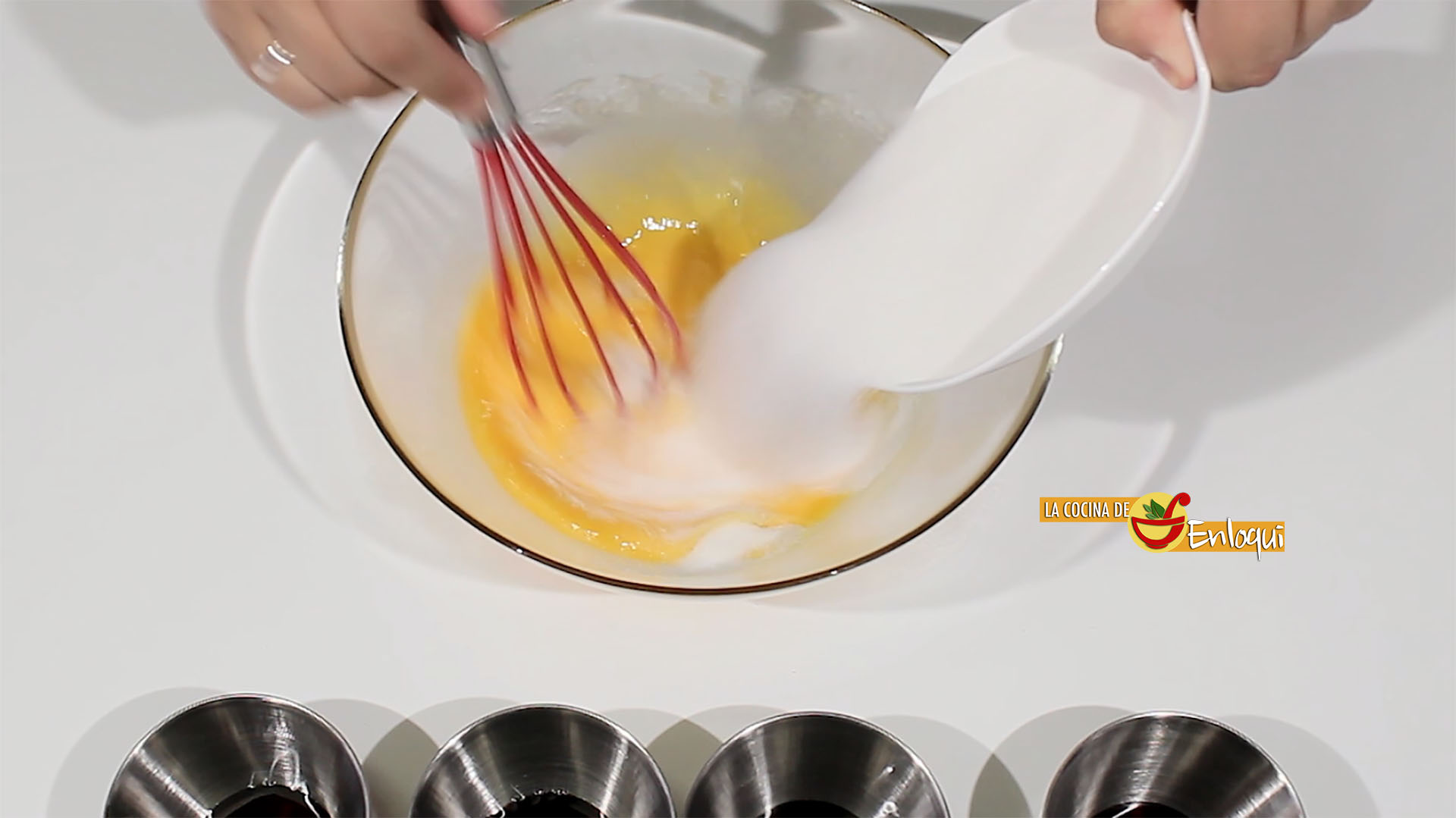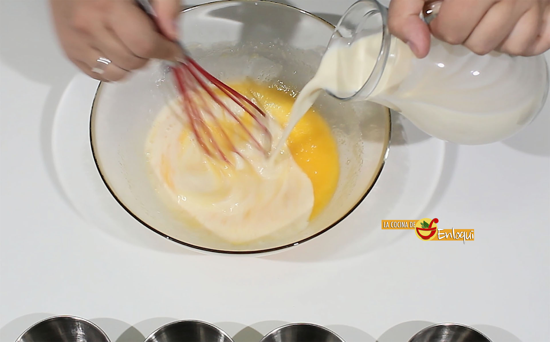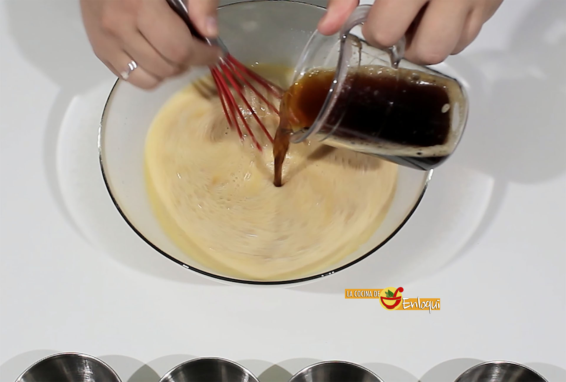 Con la ayuda de un cazo llena las flaneras con la mezcla preparada.