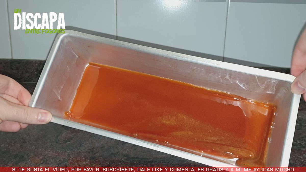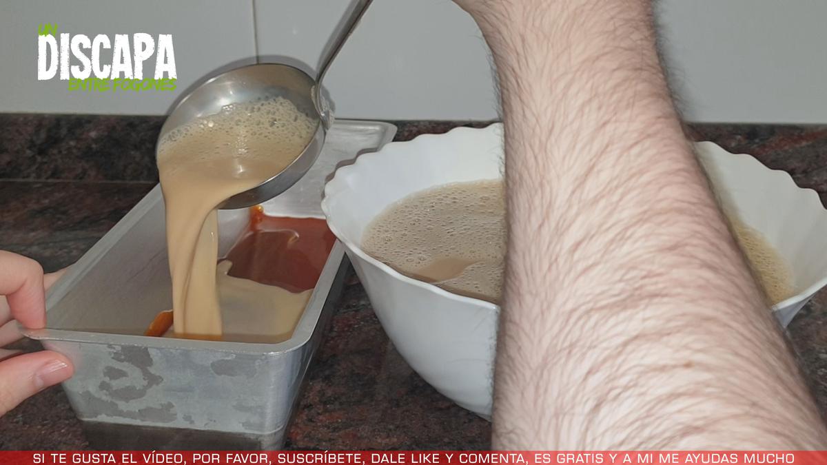 4Ahora vamos añadiendo la mezcla al recipiente donde tenemos el caramelo, yo lo estoy haciendo con la ayuda de un cazo para no gotear demasiado.