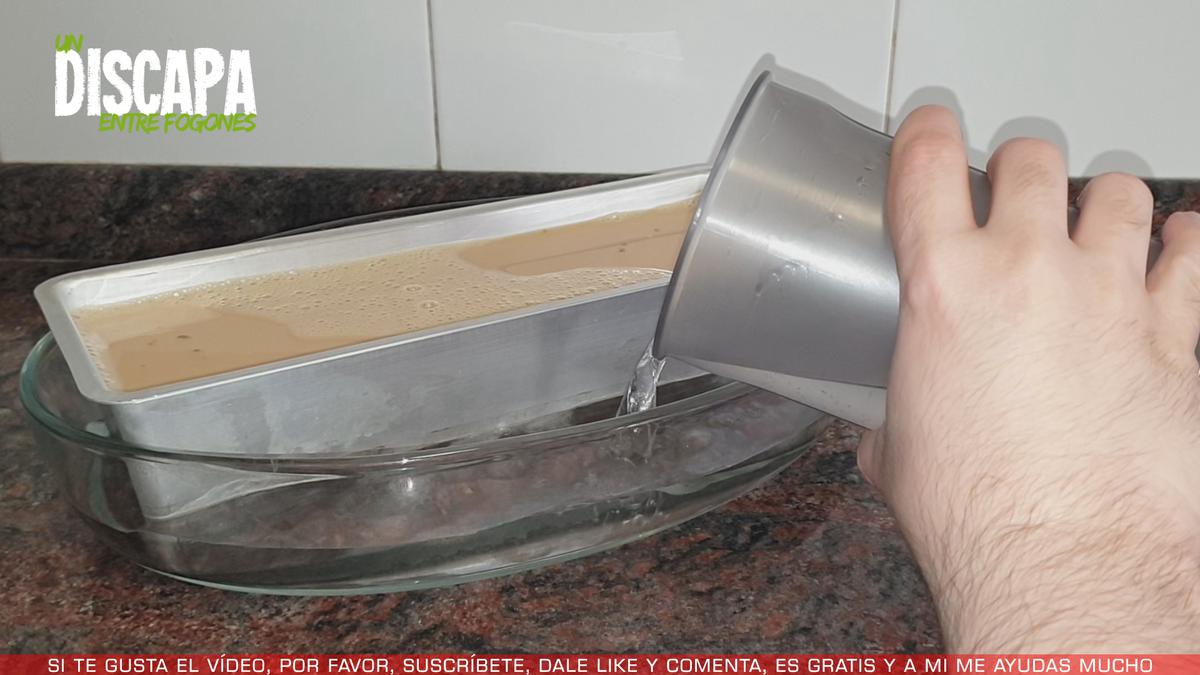 5Como el flan lo vamos a hacer al baño María, ponemos el recipiente del flan dentro de un recipiente más amplio. Añadimos un par de dedos de agua en el recipiente más amplio.