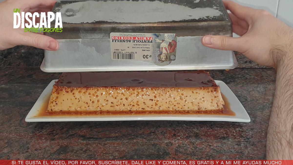 8Una vez que el flan está completamente frío procedemos a desmoldarlo. Para ayudar a desmoldarlo mejor le vamos a pasar un cuchillo por las paredes del molde. Ponemos un plato encima del molde y con un movimiento rápido damos la vuelta al molde y lo retiramos con mucho cuidado.