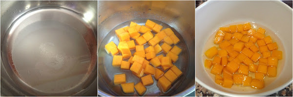 Ponemos en una cacerola pequeña el agua y el azúcar, removemos bien y añadimos la calabaza pelada y cortada en cubos. Cocinamos a fuego medio durante 12 minutos, removiendo de vez en cuando. Retiramos del fuego y reservamos.