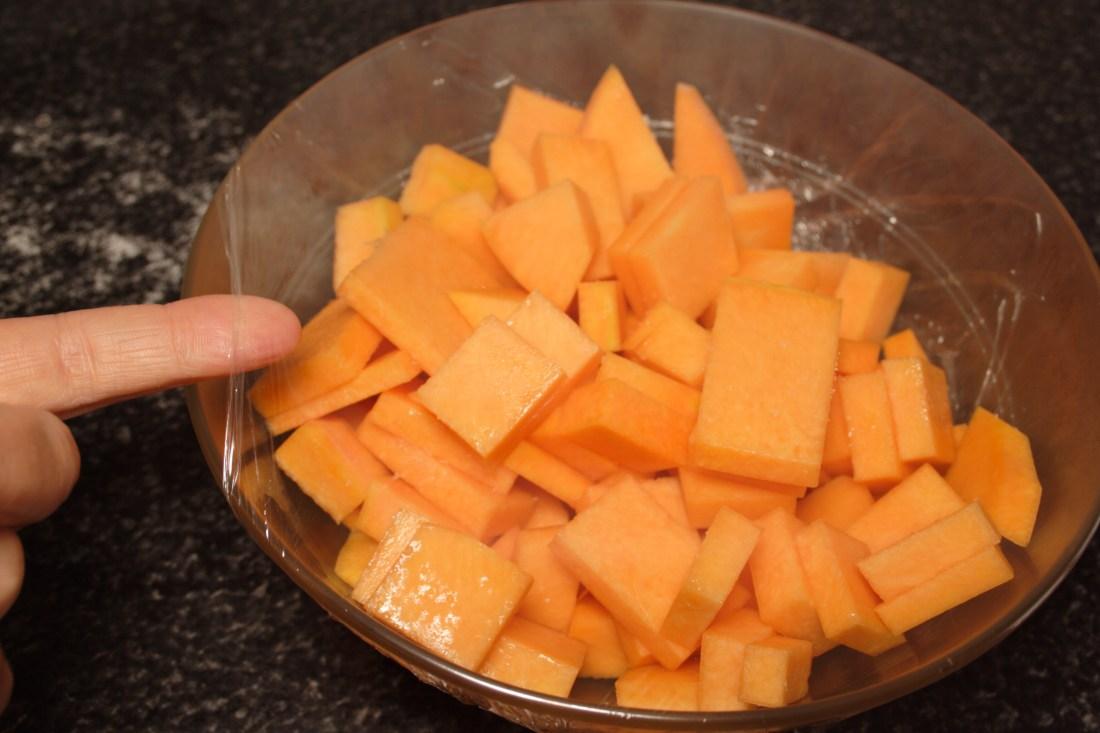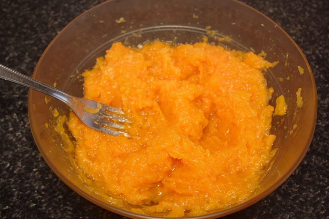Pelamos la calabaza y cortamos en daditos no muy gruesos. La ponemos en un bol con la pizca de sal, tapamos con film transparente, dejando un pequeño hueco sin tapar para que respire y la metemos en el microondas a cocer durante unos 4-6 minutos, a potencia máxima. Aplastamos con un tenedor la calabaza cocida y reservamos.
