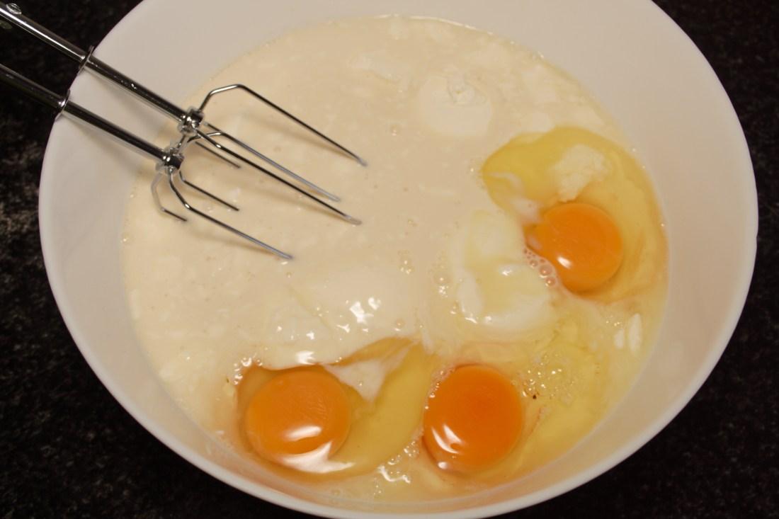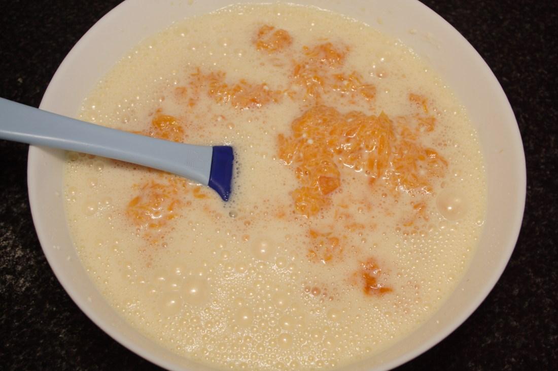 En un bol grande echamos la leche evaporada, los huevos, el queso crema y la leche condensada. Batimos con las varillas eléctricas hasta que resulte una crema homogénea e incorporamos la calabaza cocida, mezclamos bien.