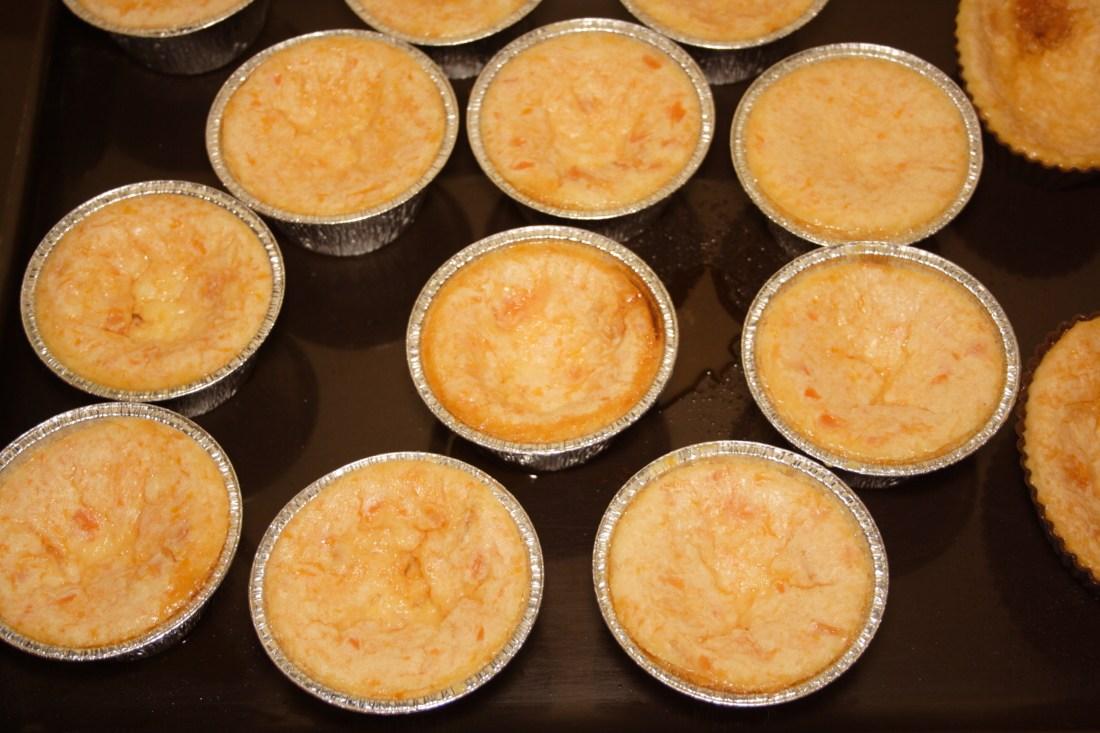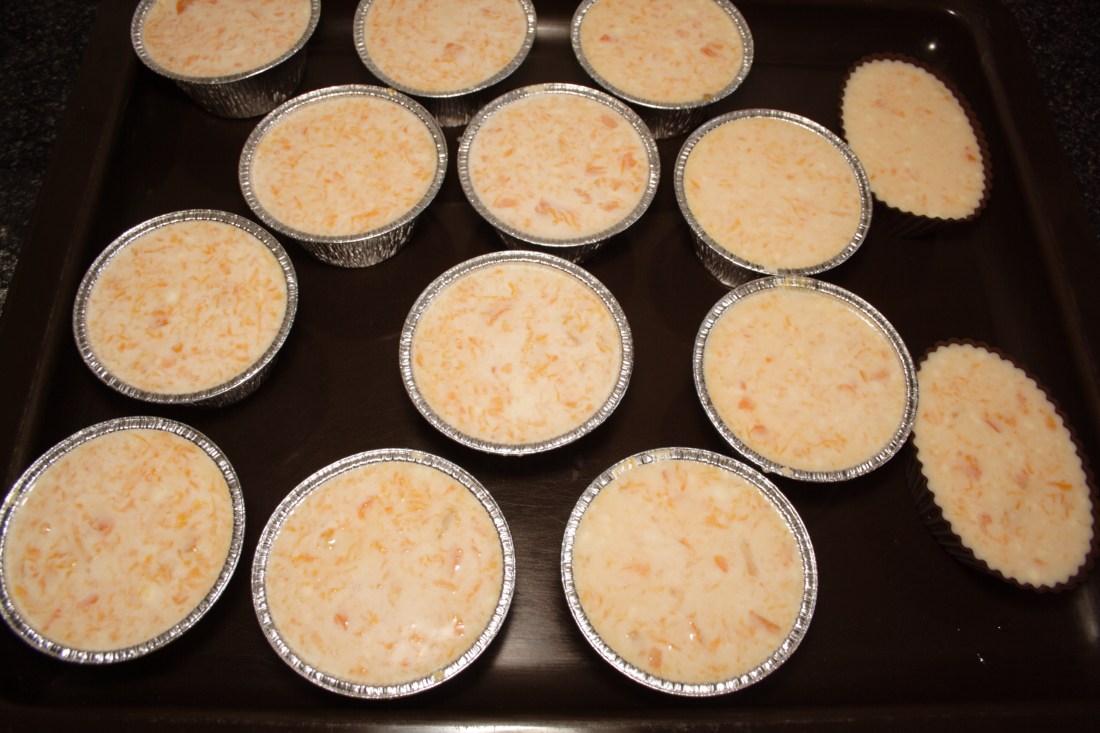 Repartimos la mezcla en los moldes y horneamos a 150ºC, calor arriba y abajo, durante 50 minutos. Es un flan curioso porque no va al baño María, se colocan los moldes directamente en una bandeja de horno y a cocer.