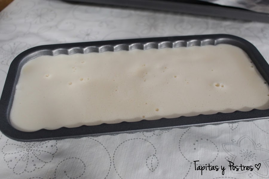 Vertemos esta mezcla en un molde alargado con caramelo líquido, a través de un colador, para quitar un poco la espumilla que se forma. Tapamos con papel aluminio.