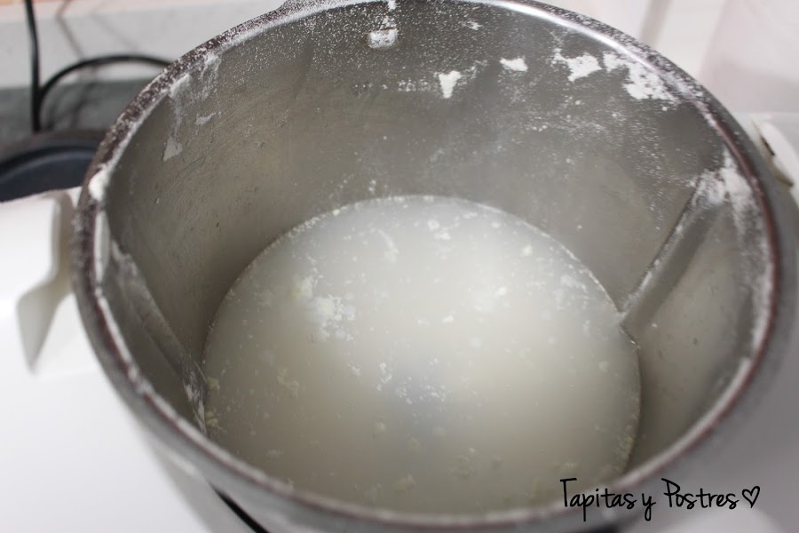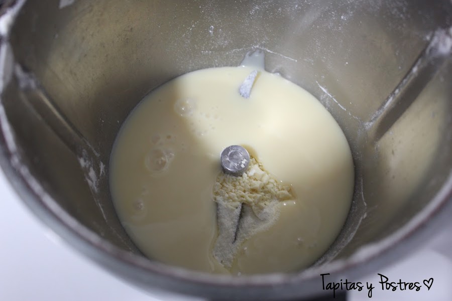 Añadimos la leche condensada y el agua y removemos 15 segundos a velocidad 4. Calentamos cinco minutos a 50º y velocidad 3.