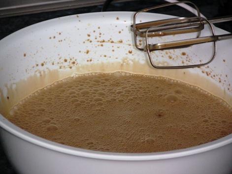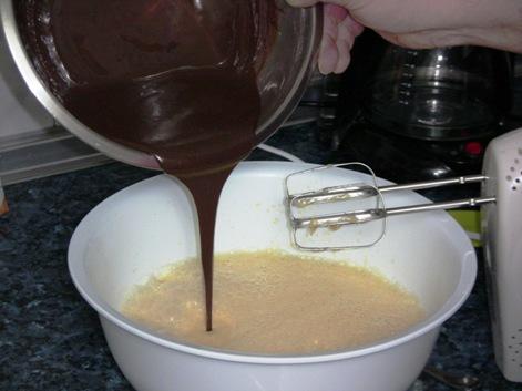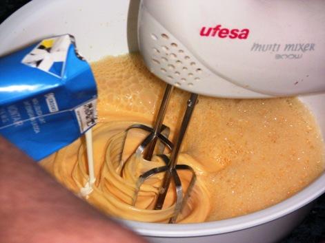 Finalmente y en un bol amplio ponemos los 12 huevos con el azúcar y batimos bien, añadimos la nata (crema de leche) sin parar de batir y finalmente el chocolate, ya solo nos falta meterlo al horno y esperar de 35 a 40 minutos que es lo que le cuesta hacerse, por supuesto lo debéis de comprobar con el viejo truco de la aguja…