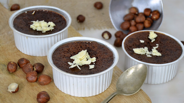 5. Una vez los sacamos del horno dejamos que pierdan un poco de temperatura y luego los metemos a la nevera para que terminen de enfriarse. Los servimos desmoldados o en los mismos moldes. Para decorar podemos añadir unas avellanas picada, un poco de chocolate rallado, sirope de chocolate o, porque no, unos frutos rojos