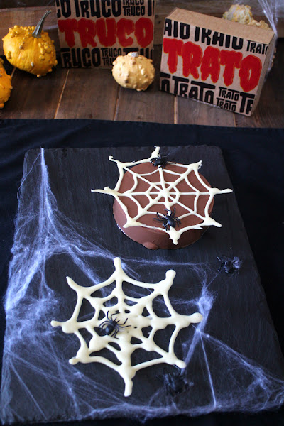 Por supuesto decoré un poquito la pizarra que utilicé a modo de bandeja para servirlo con unas telas de araña y muchas arañas...
