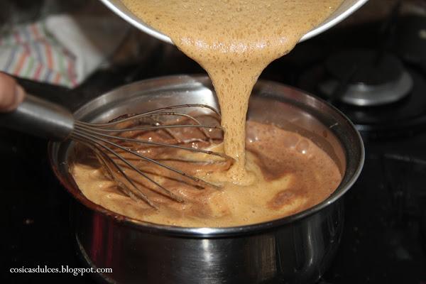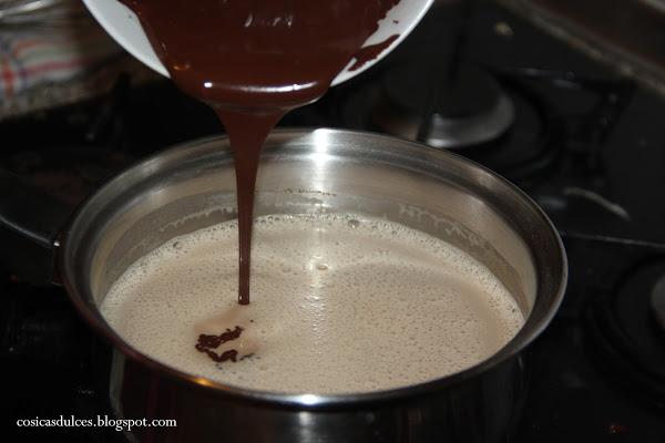 Cuando rompa a hervir añadimos el chocolate que habremos deshecho previamente y mezclamos todo bien.