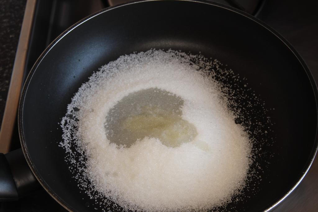 Ponemos 120 gr del azúcar a calentar en una sartén antiadherente y añadimos el zumo del limón. Hacemos un caramelo tostado, repartimos en los moldes y reservamos.