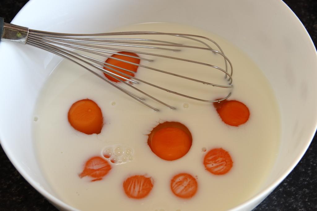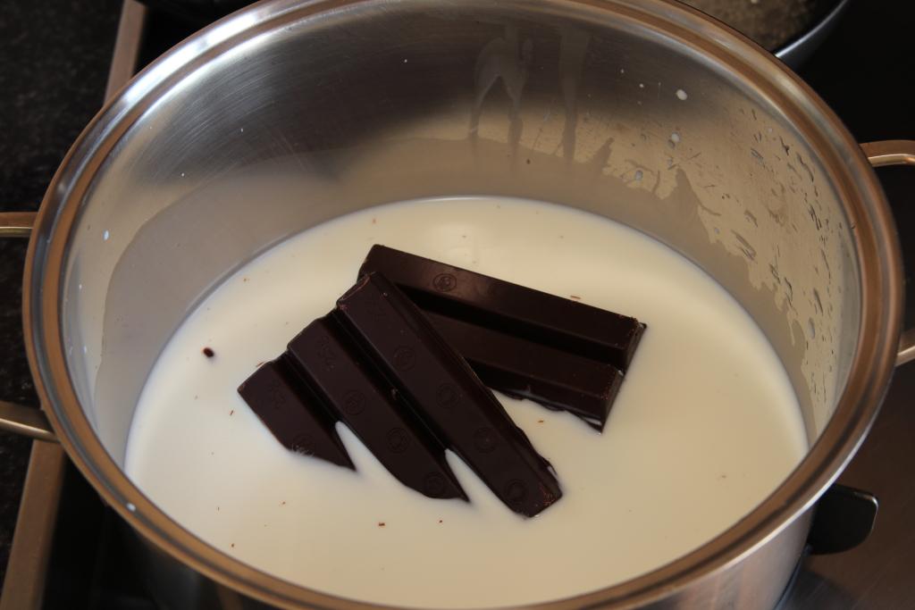 En un cazo calentamos la mitad de la leche y el chocolate troceado. Dejamos que se disuelva y reservamos. En un bol colocamos el resto de la leche, añadimos los huevos, las 4 yemas, el resto del azúcar blanco y mezclamos bien.