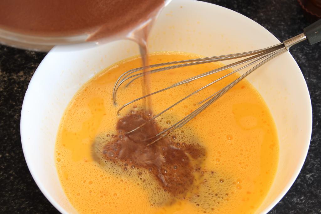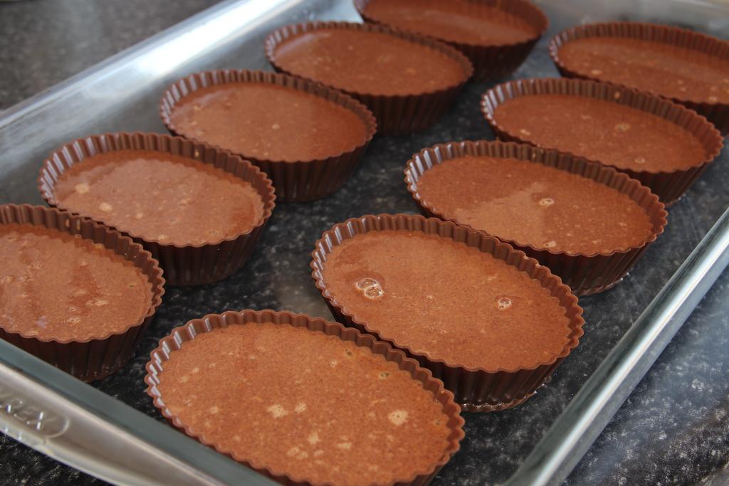 Incorporamos un poco de la leche chocolateada, mezclamos y añadimos el resto, seguimos batiendo. Repartimos la mezcla en los moldes y horneamos a baño María durante 30 minutos.
