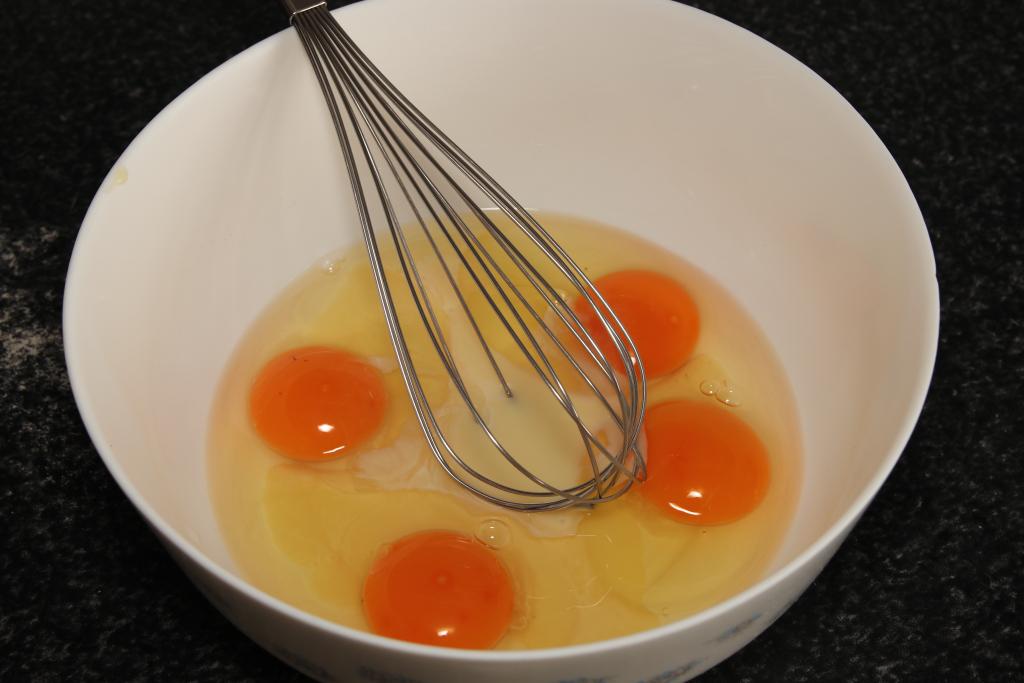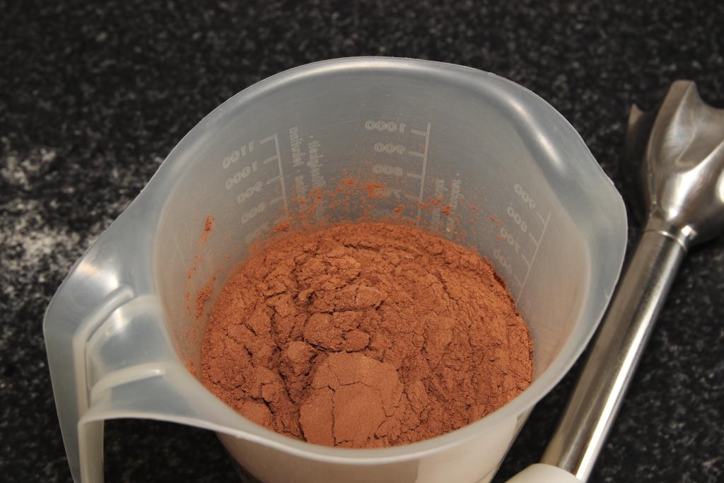 En un vaso batidor o jarra ponemos el cacao, vertemos la leche y batimos con la batidora eléctrica hasta que quede todo bien emulsionado. Incorporamos la mezcla del cacao al bol de los huevos con la leche condensada, mezclamos bien.