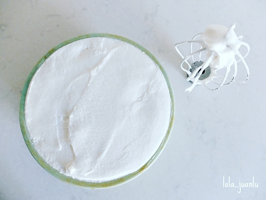 Cuando el caramelo está totalmente frío, pasamos las claras montadas al molde. Con una lengua lo nivelamos y damos unos golpes para, si se ha quedado alguna burbuja de aire, salga y termine de quedar uniforme.