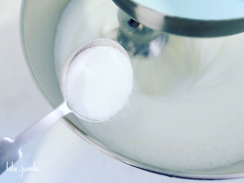 Vertemos las claras de huevo en un bol o en un vaso de un procesador de alimentos con el accesorio de montar. Vamos a ir batiendo hasta que las claras estén un poco montadas sin llegar a formar picos firmes. Y sin dejar de batir le vamos a ir añadiendo el azúcar, cucharada a cucharada, poco a poco, de esta manera se integrará sin dañar su crecimiento.