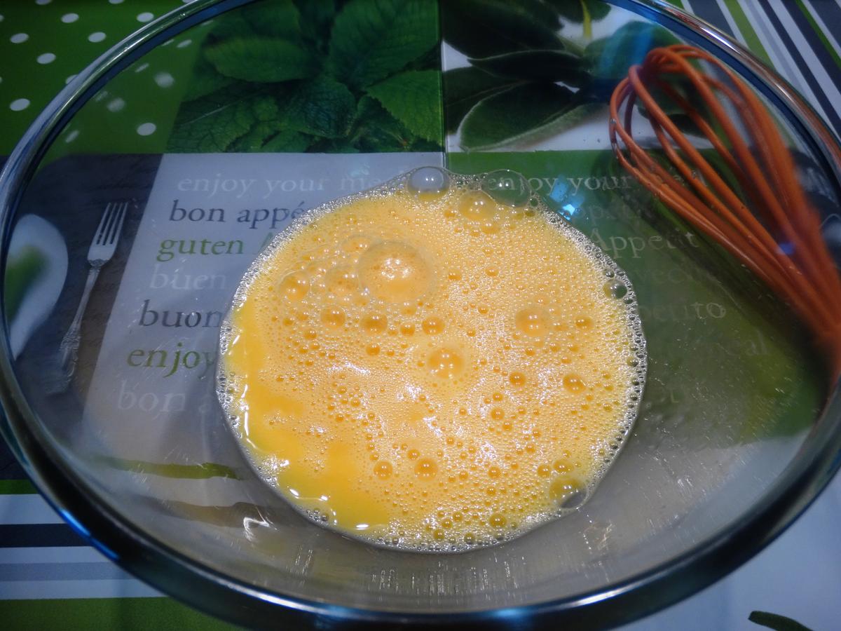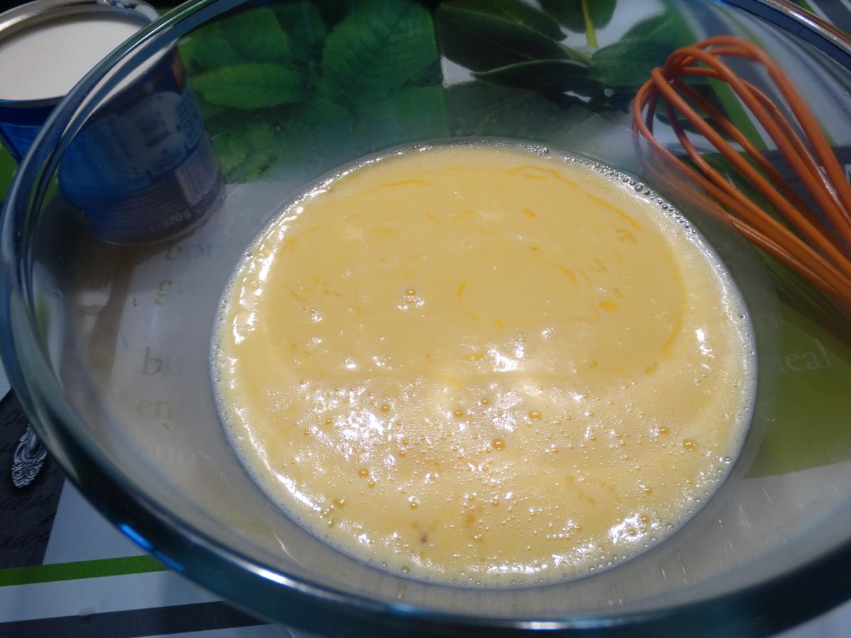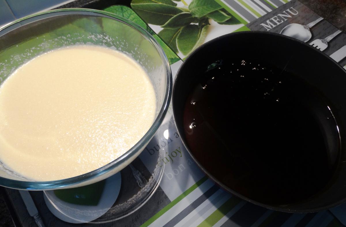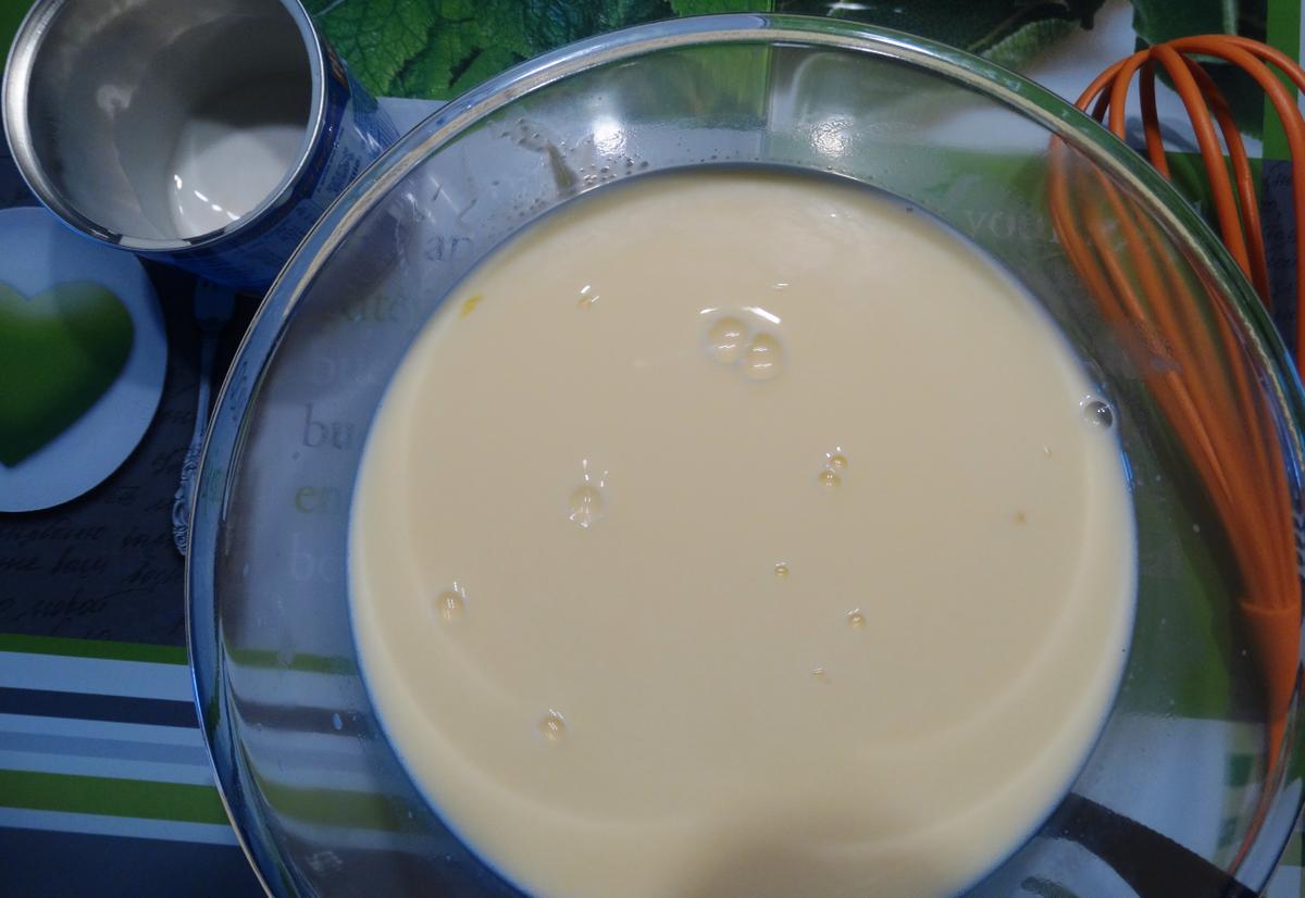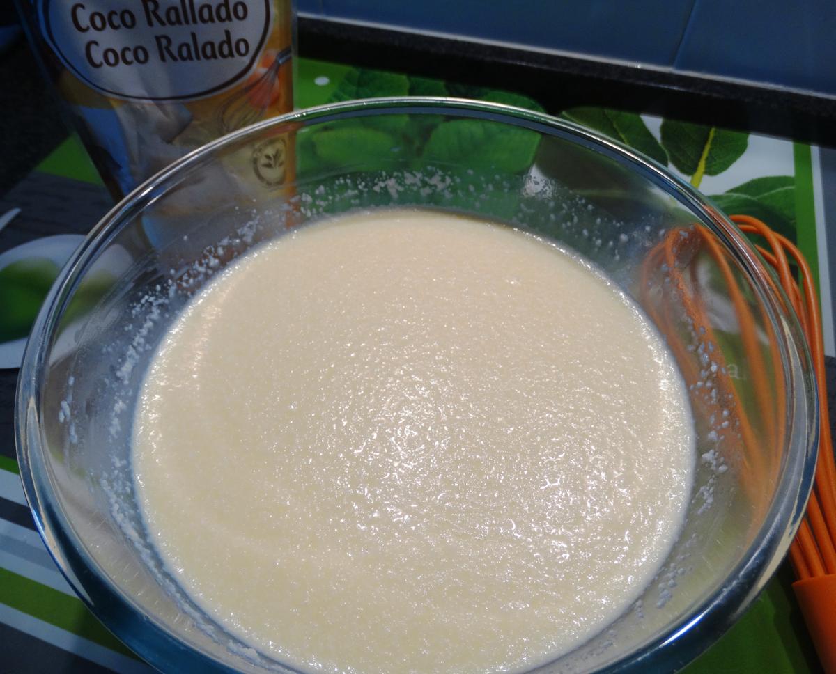 Batimos los huevos en un bol y añadimos la leche. Seguimos batiendo y agregamos la leche condensada y el coco rallado hasta conseguir una mezcla homogénea.