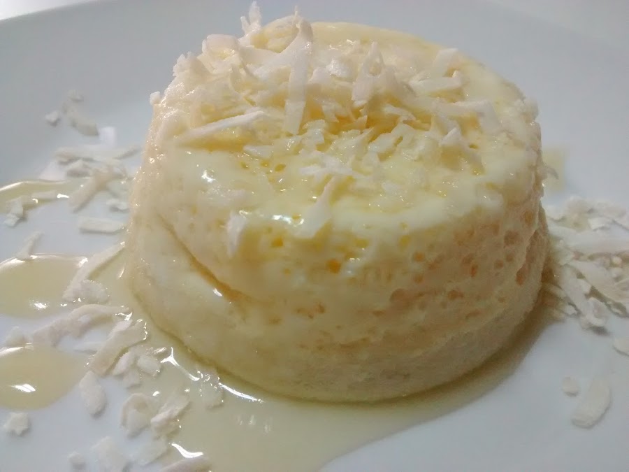 Elaboración: Mezclamos en un bol los huevos y el sirope de agave y batimos bien. A continuación incorporamos el coco y la leche y seguimos batiendo.