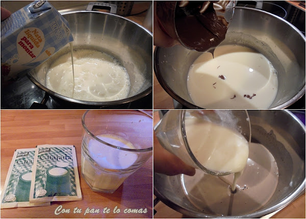 1. Separa un vasito de leche y pon a calentar el resto de la leche con la nata (crema de leche) líquida y el azúcar.