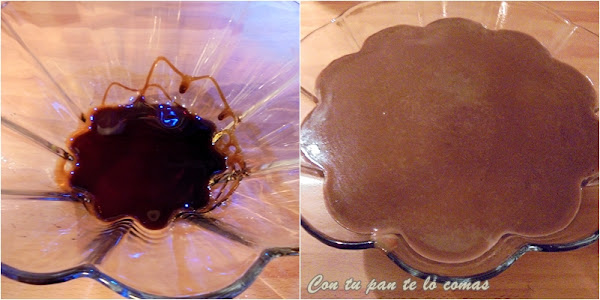 4. En una flanera pon caramelo líquido en el fondo y echa el contenido de la cazuela con cuidado de que no se mezcle con el caramelo (déjalo resbalar por las paredes poco a poco).