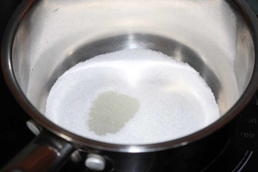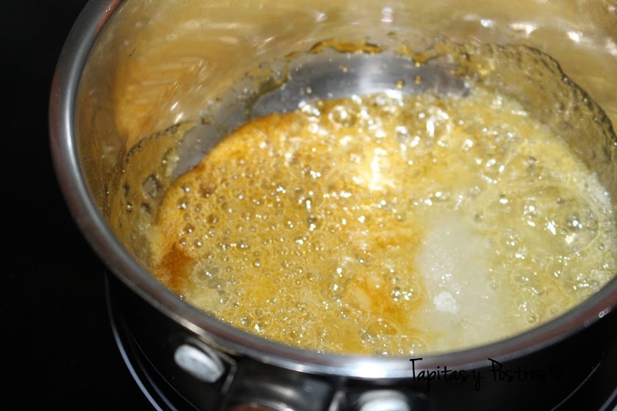 En un cazo o sartén ponemos el azúcar con el agua y el limón a fuego medio alto. Dejamos que se vaya fundiendo el azúcar sin tocar hasta que se forme un caramelo dorado. Vertemos este caramelo en un molde alargado. Echamos las almendras en cubitos encima y reservamos.