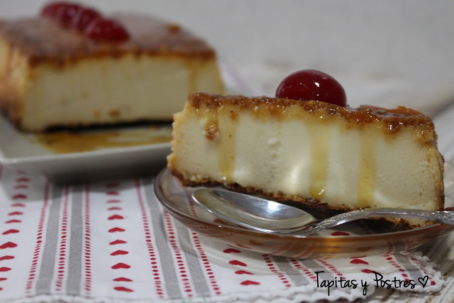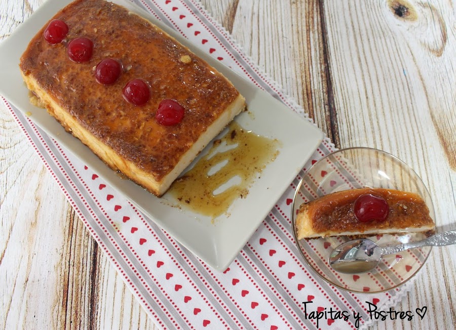 Después de unas horas, así queda nuestro flan. Decoramos con guindas.