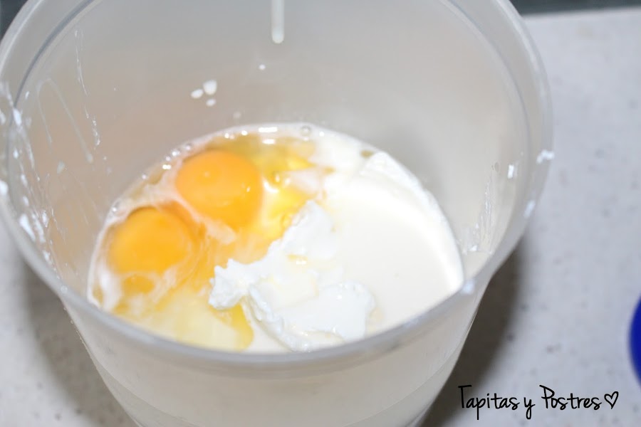 En un recipiente ponemos la leche condenada, la leche evaporada, el queso y los huevos y batimos hasta que nos quede una crema homogénea.