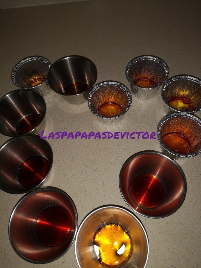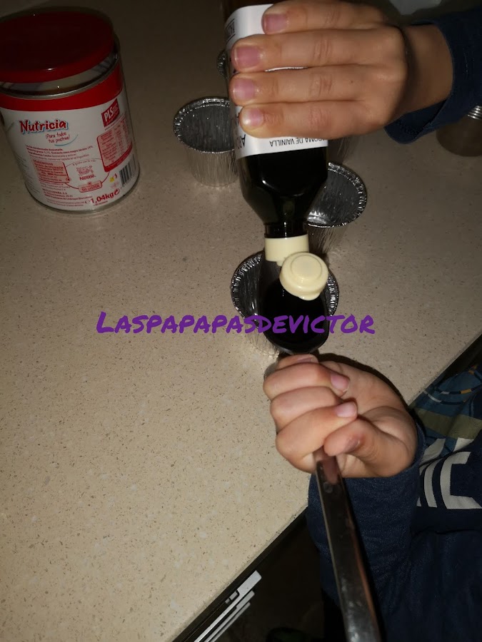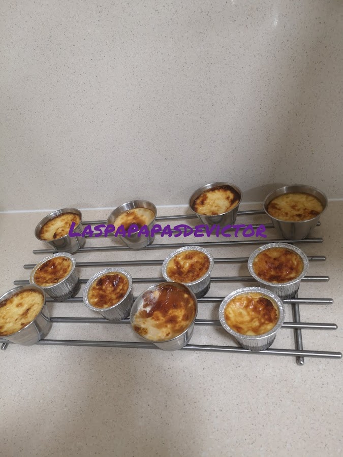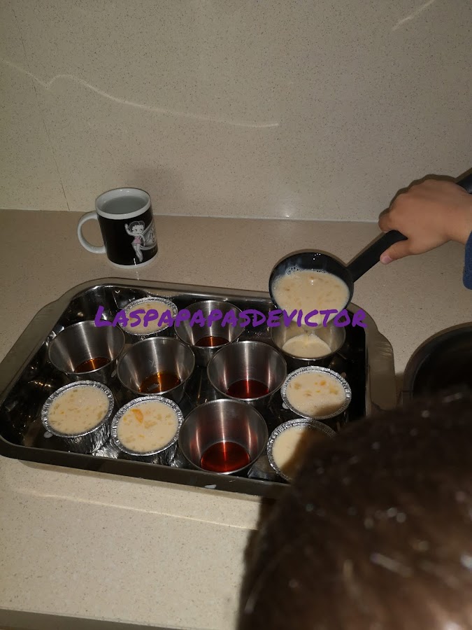 Poner los vasitos dentro de una bandeja y añadir a la bandeja agua , que los haremos al baño Maria.
