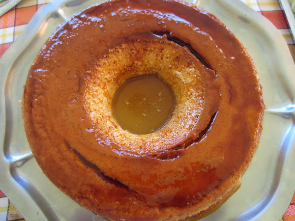 Ponemos sobre el molde caramelizado y cocemos a 170º durante una hora, aproximadamente. A los 50 minutos podemos mirar a ver si está cocido. Introducimos una aguja de tejer, y si sale limpia lo tenemos. Dejamos enfriar antes de desmoldar.