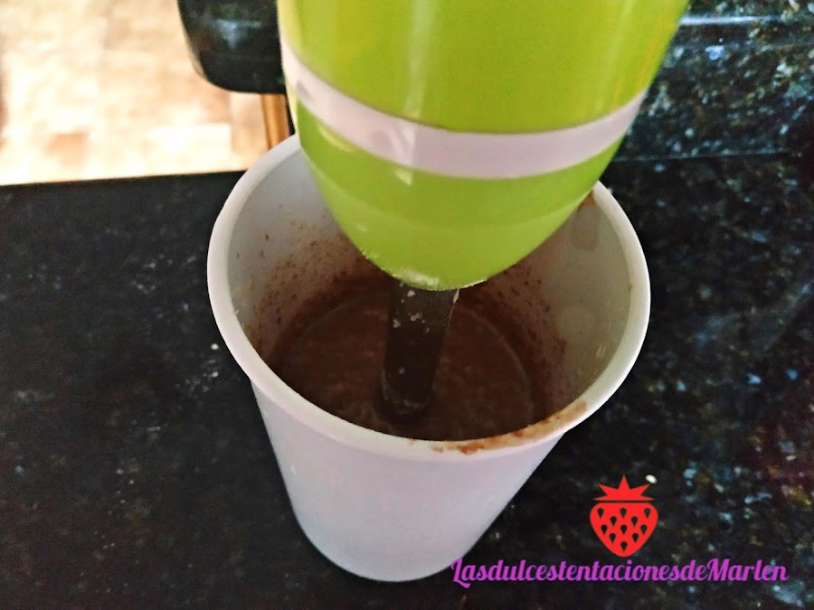 Trituramos con la batidora, los bombones con la mitad de la leche.