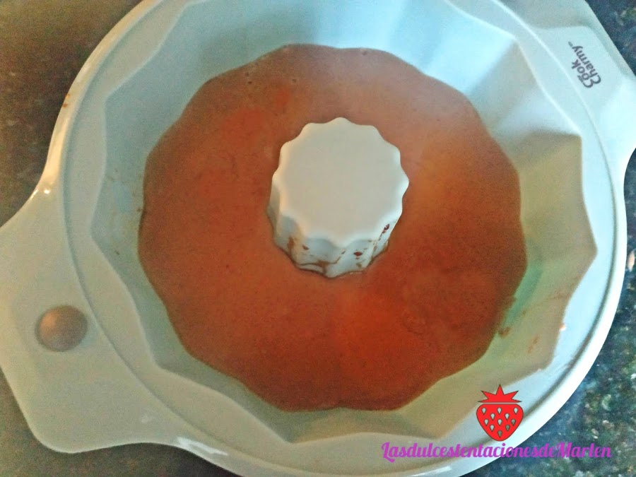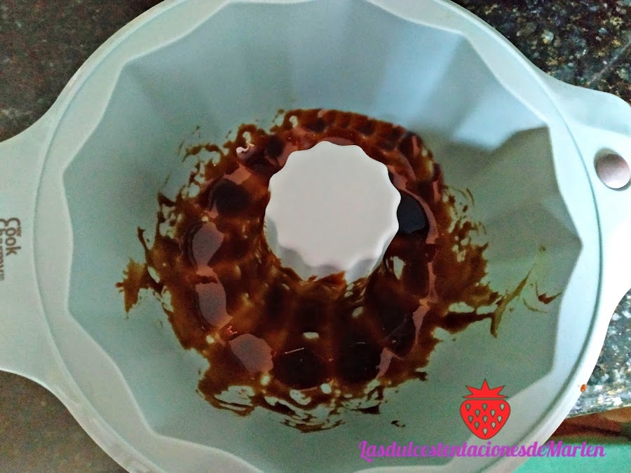 Le ponemos al molde el caramelo por toda la base y seguidamente le vamos a añadir la mezcla que hemos dejado 5 minutos que enfríe un poco.
