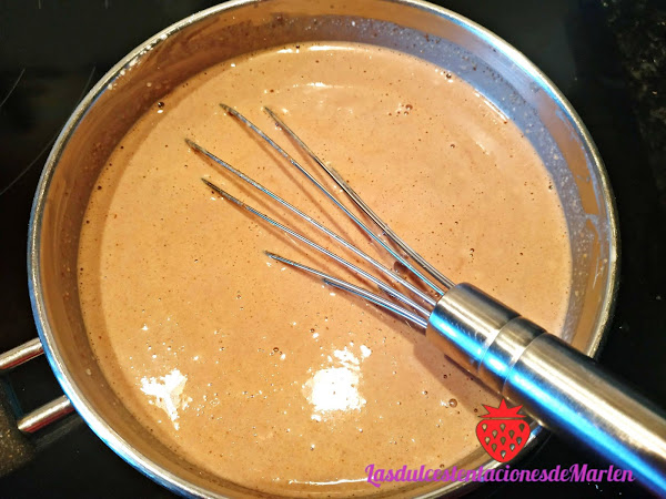En un cazo ponemos el reto de la leche, la nata (crema de leche) y la mezcla de los Ferrero Rocher. Ponemos los sobres de cuajada y removemos todo muy bien con unas varillas, ponemos a fuego medio sin dejar de mover. Lo llevaremos hasta el punto exacto de que empiece a hervir y entonces lo retiraremos del fuego.