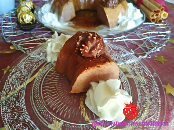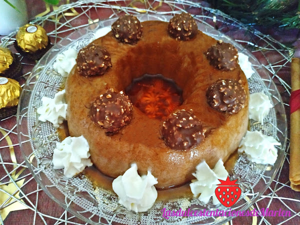 Desmoldarlo cuando lo vayáis a servir. Yo lo he decorado con nata (crema de leche) es spray y mitades de bombones Ferrero.