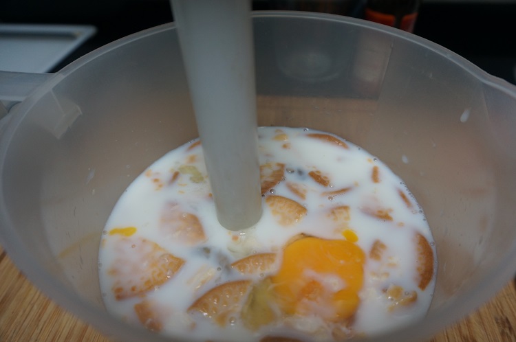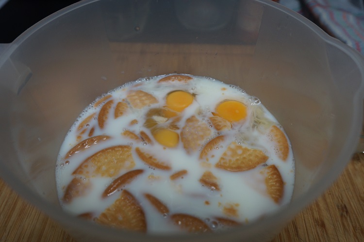 En un bol pondremos todos los ingredientes menos el caramelo. Pondremos la leche, las galletas, los huevos y el azúcar. Lo batimos.
