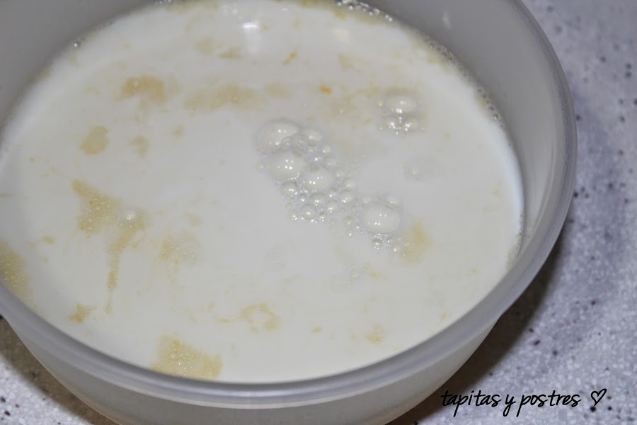 Añadimos la leche y batimos ligeramente con unas varillas.