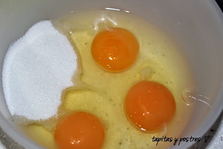 En un bol ponemos los huevos y el azúcar. Lo removemos con unas varillas, sin batidora.