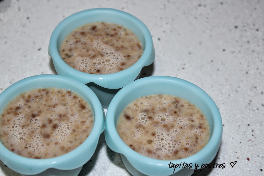 Lo vertemos en los moldes que habremos caramelizado. Estos son unos moldes de silicona del Ikea. Ya no hace falta colar la mezcla, porque entonces no caerían las migas de las galletas.