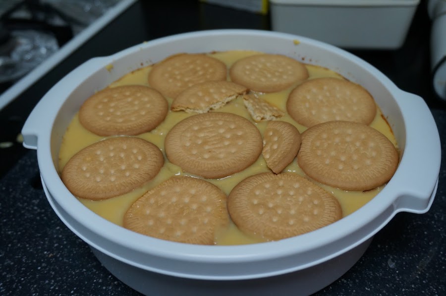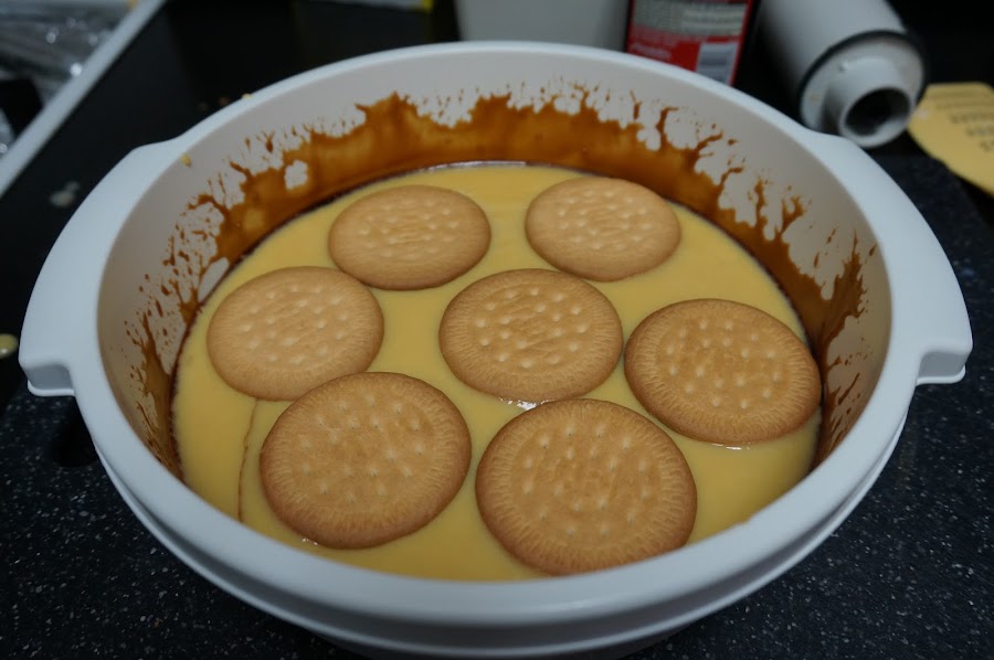 Pondremos una capa de galletas y cubrimos con una parte del flan, luego otra de galletas y otra de flan.