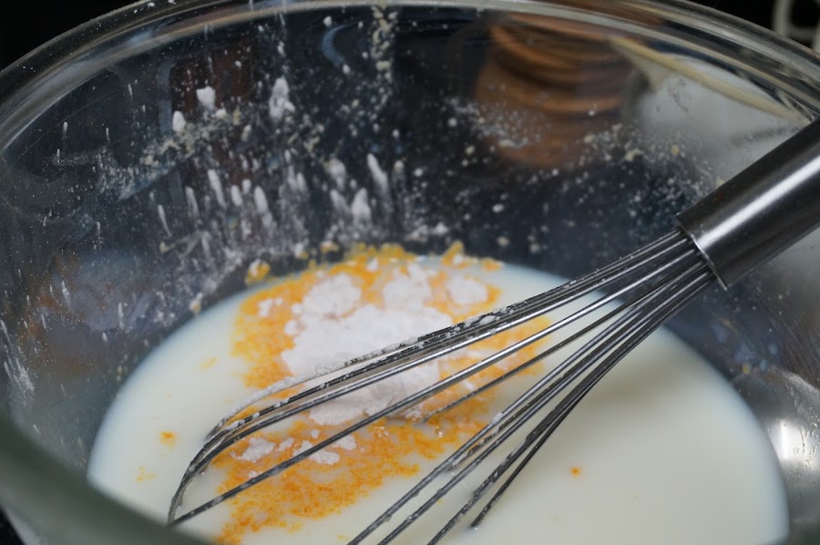 Mientras en otro bol ponemos el resto de la leche, un cuarto y echaremos los dos sobres de flan y desleímos el contenido de ellos.