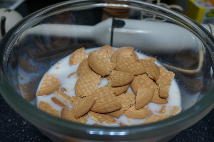 Ponemos en un cazo el litro de leche y ponemos unas 10-12 galletas a trozos, lo podemos triturar o lo dejamos que se disuelvan junto con la leche.